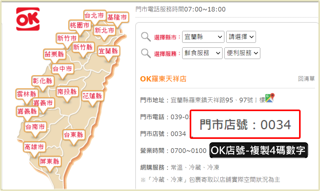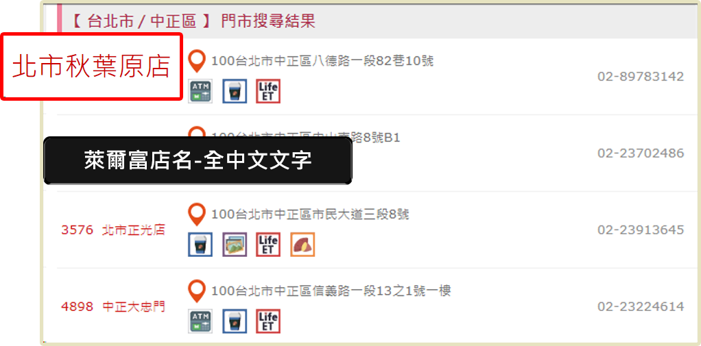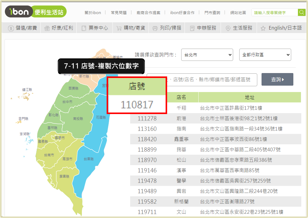 ➌ 頁面顯示的門市表格,店號欄位資料即該超商的門市店號。